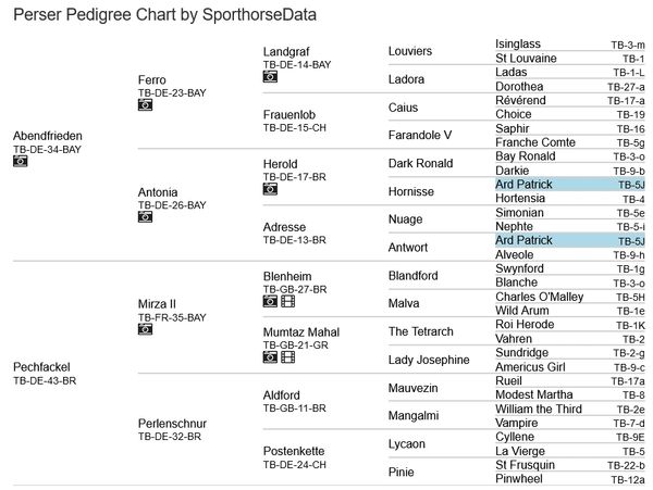 Walldorf passes his genetic lineage through his sire Watzmann having 2 crosses to Flugelmann I (a son of Flavius by Fling) as well as his marvelous Dam Parodie, by the TB stallion Perser who was crossed on Wohler, a stallion with genetic prepotency with Fling and Alderman.