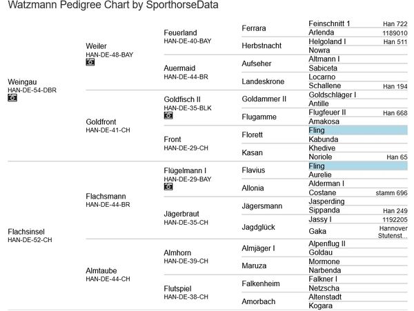 Watzmann is a son of the extremely valuation stallion Weingau, who can be found in the dam lines of many performance horses. Watzmann has made a name for himself as an outstanding jumper sire. On the occasion of his stallion performance test, he was described as follows, "Walk good, trot and canter very good, eager temperament, enduring constitution, rideability good, jumping, above average.